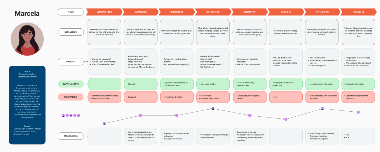 In order to help our users, we need to learn a bit more about them. Surveys were distributed, user interviews were conducted, and we participated in Mission Graduates workshop as an ethnographic study.